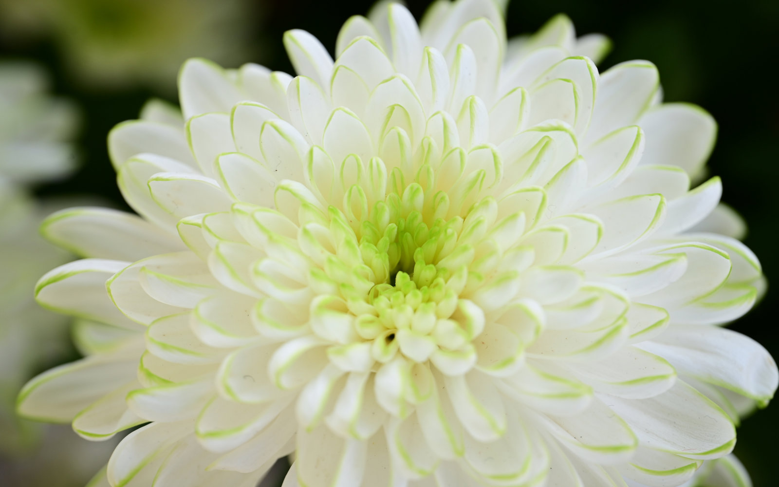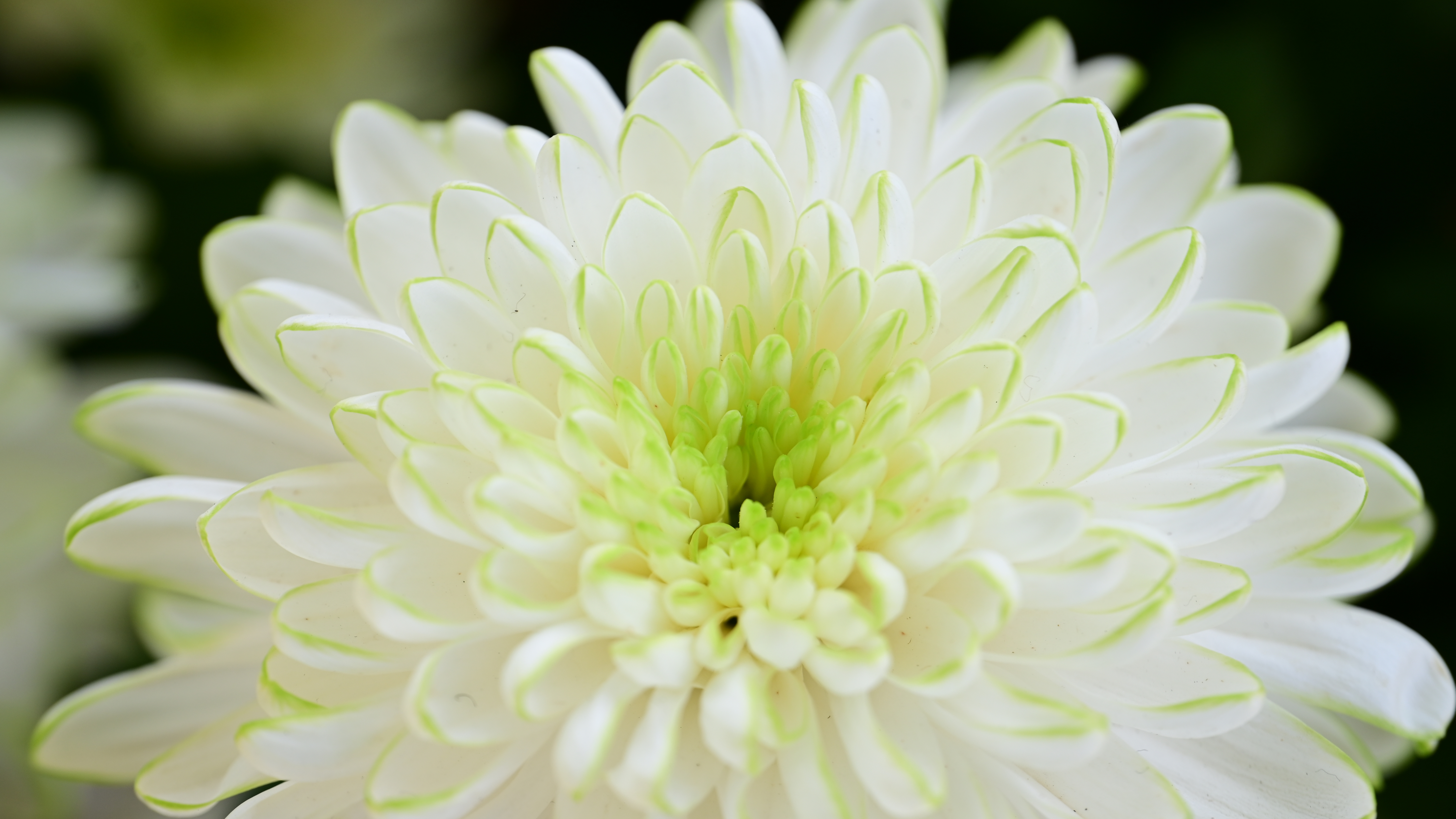 A pristine white chrysanthemum whose layered petals are delicately edged with a soft, natural green, creating an elegant gradient that evokes the freshness of morning frost touched by jade.