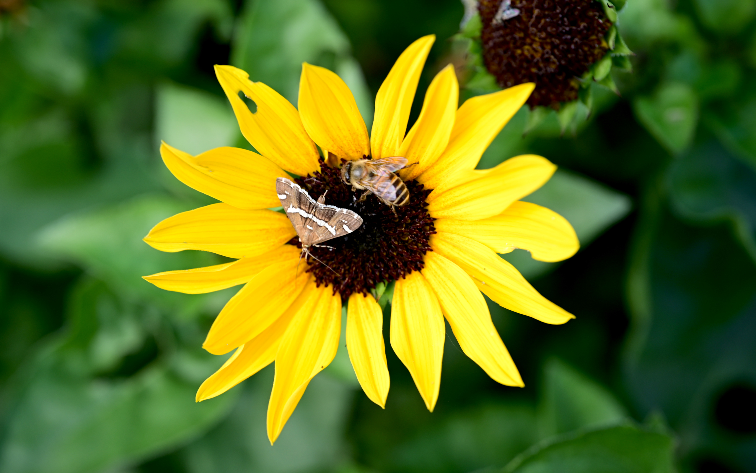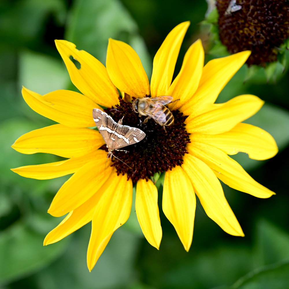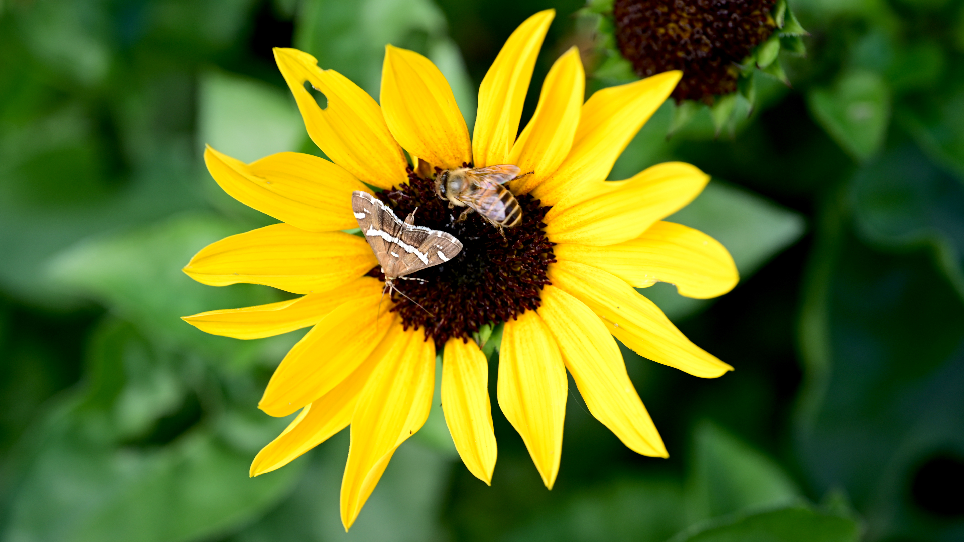 A bright yellow daisy in full bloom, its rich brown center visited by a bee and a moth intently drinking nectar.