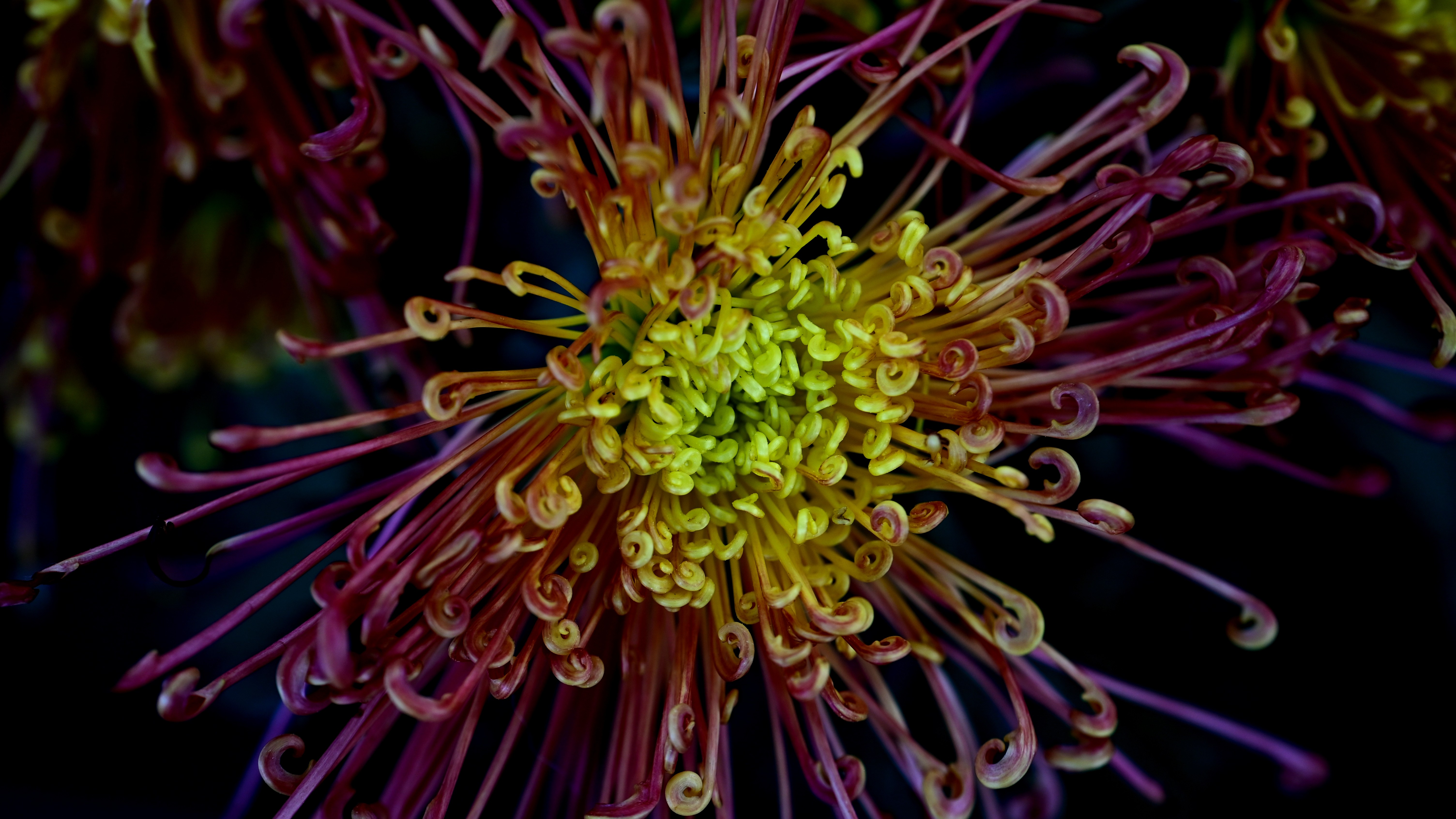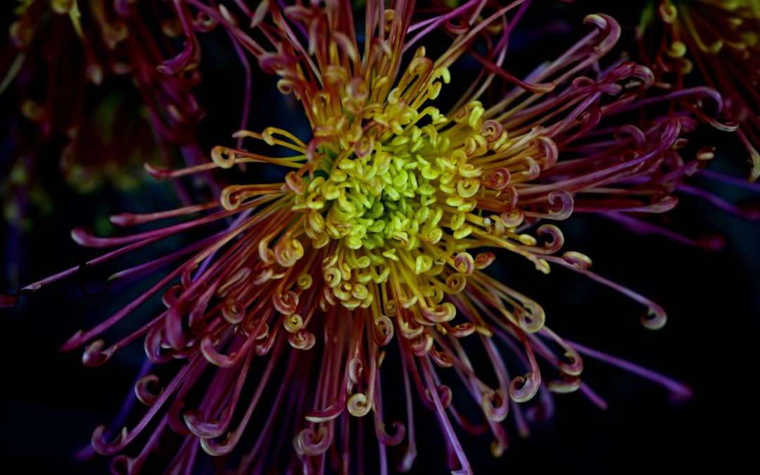 Each petal, tinged with a deep red hue and delicately curled at the edges, unfolds like fine silk around a textured center of bright green florets.