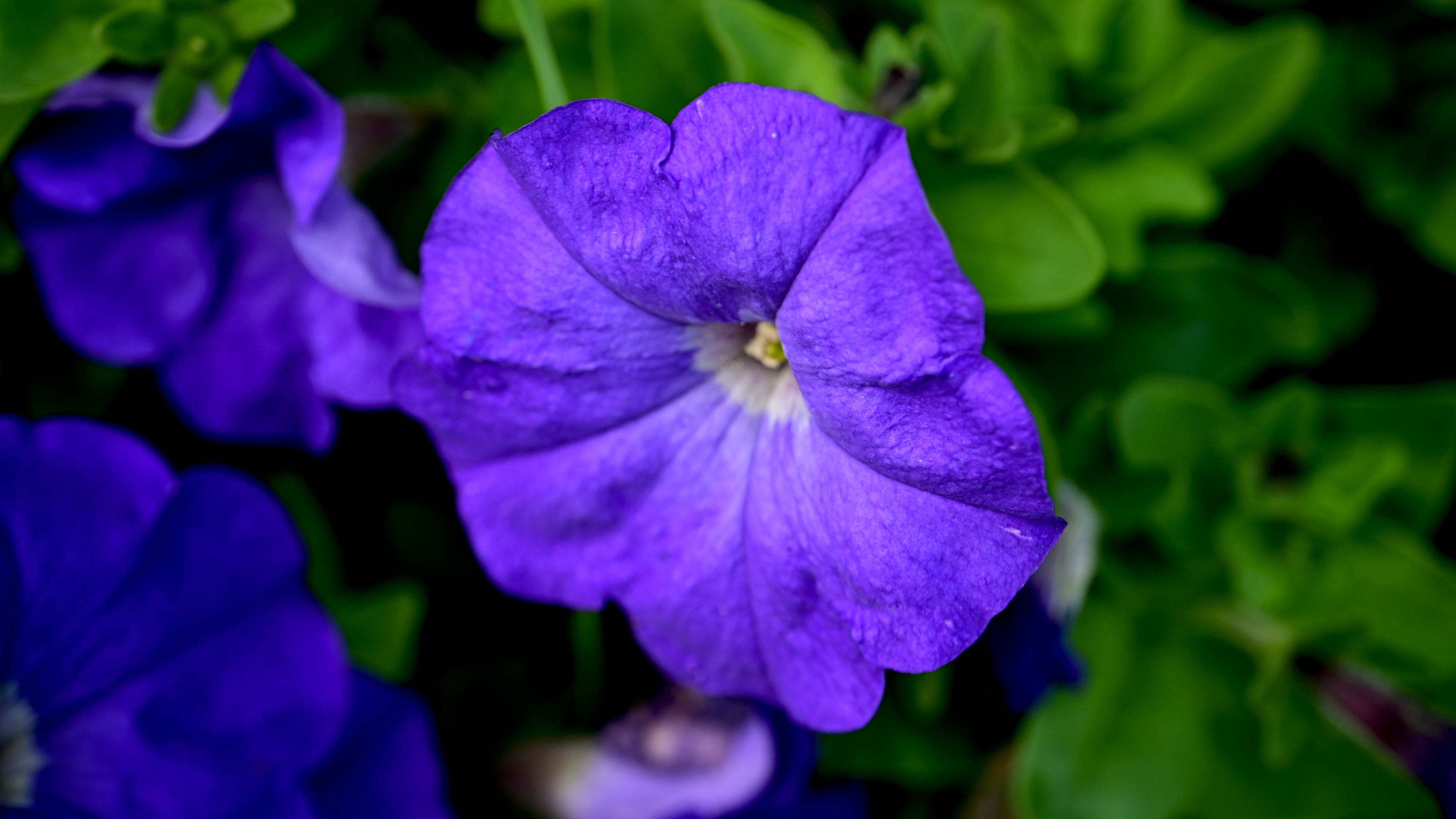 Immerse yourself in the dreamy close-up of a twilight-purple petunia, where velvety textured petals glow softly against a lush