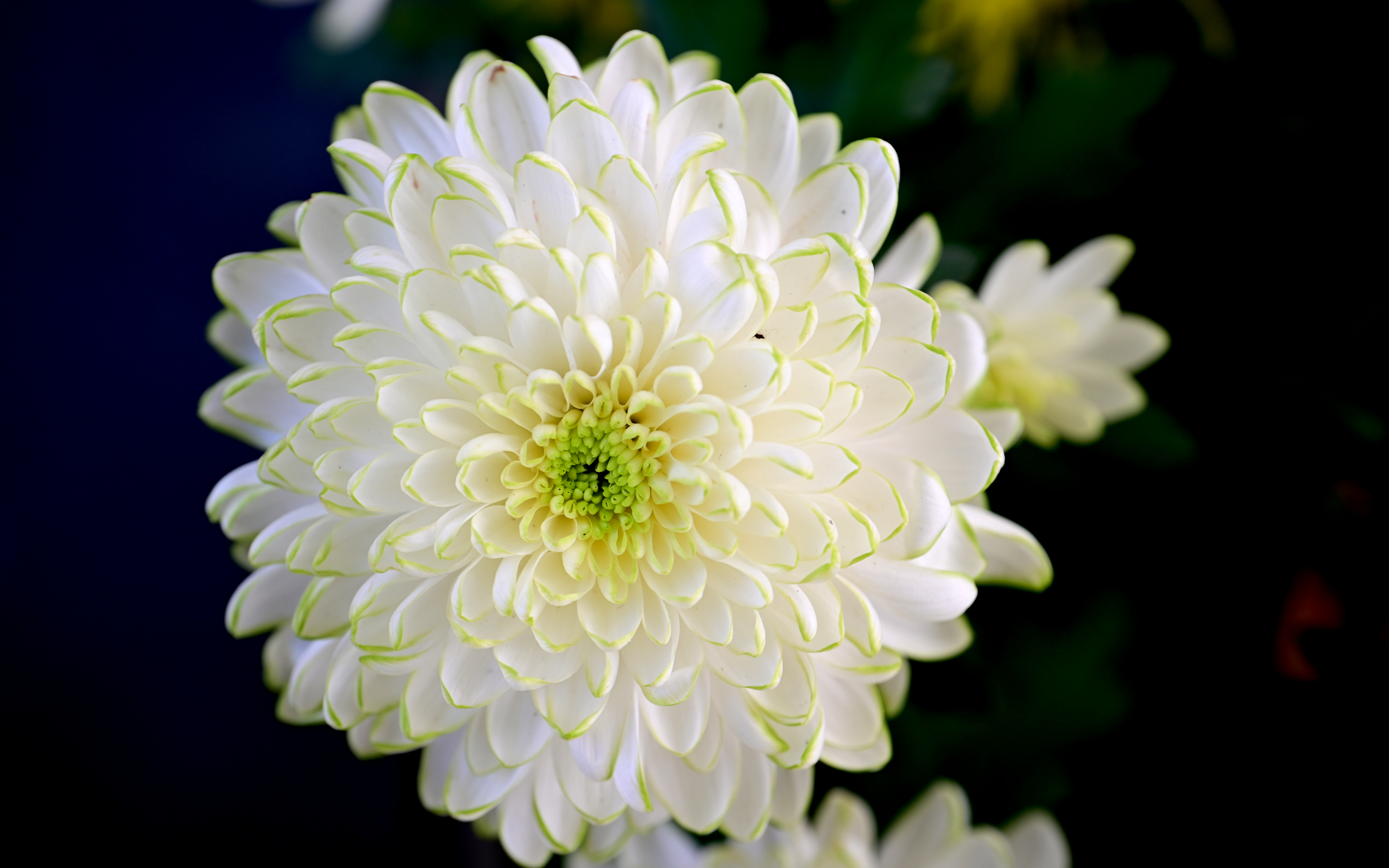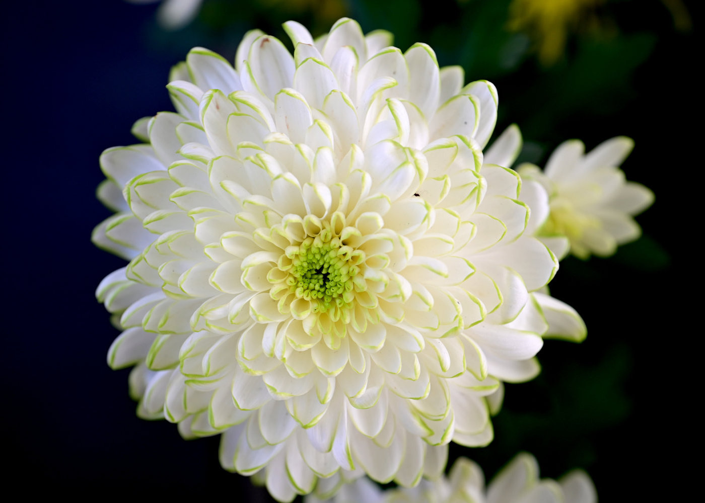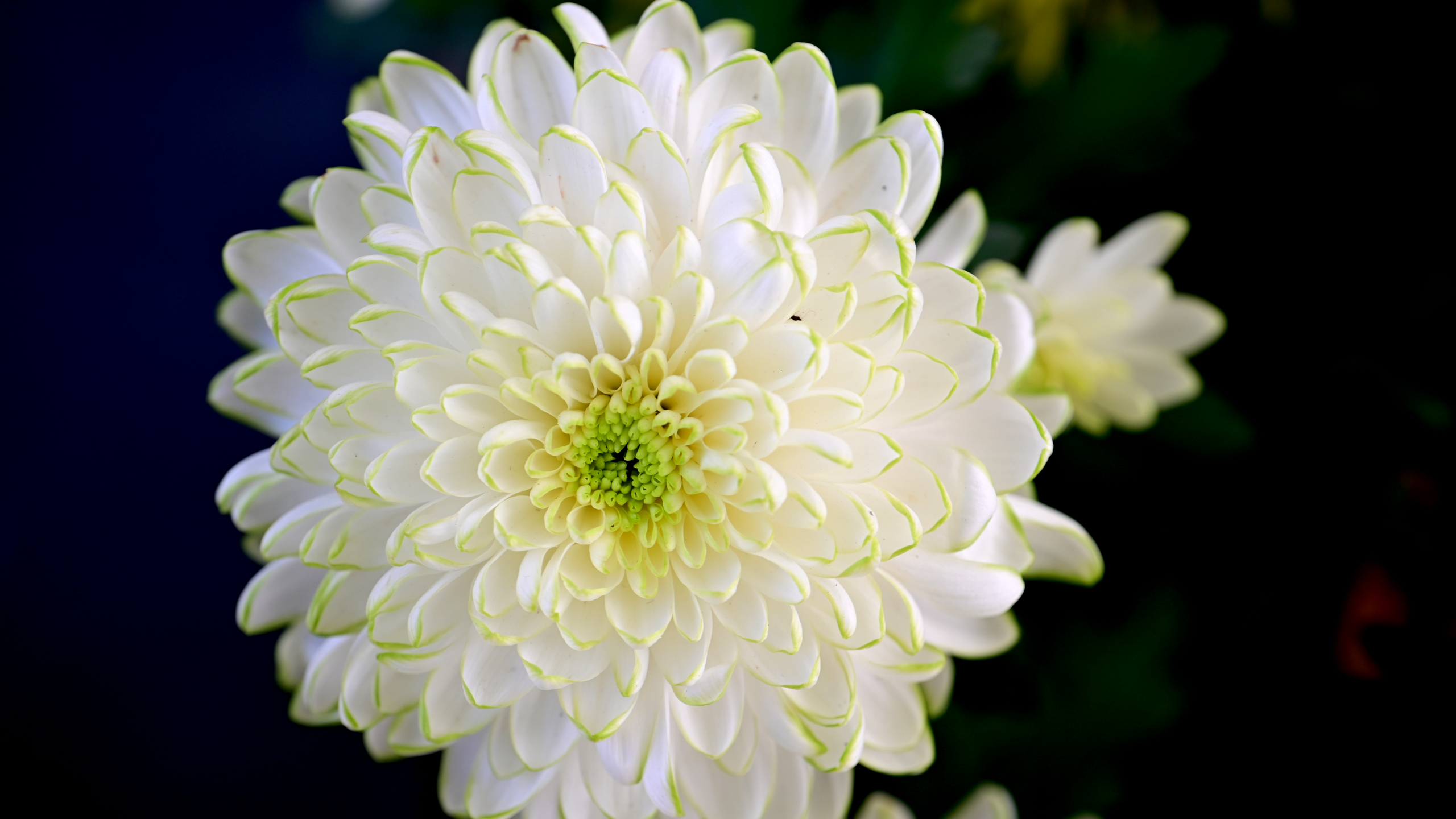 Witness the serene beauty of a blooming white chrysanthemum, its layered petals edged in soft green, glowing like gentle light against a tranquil.
