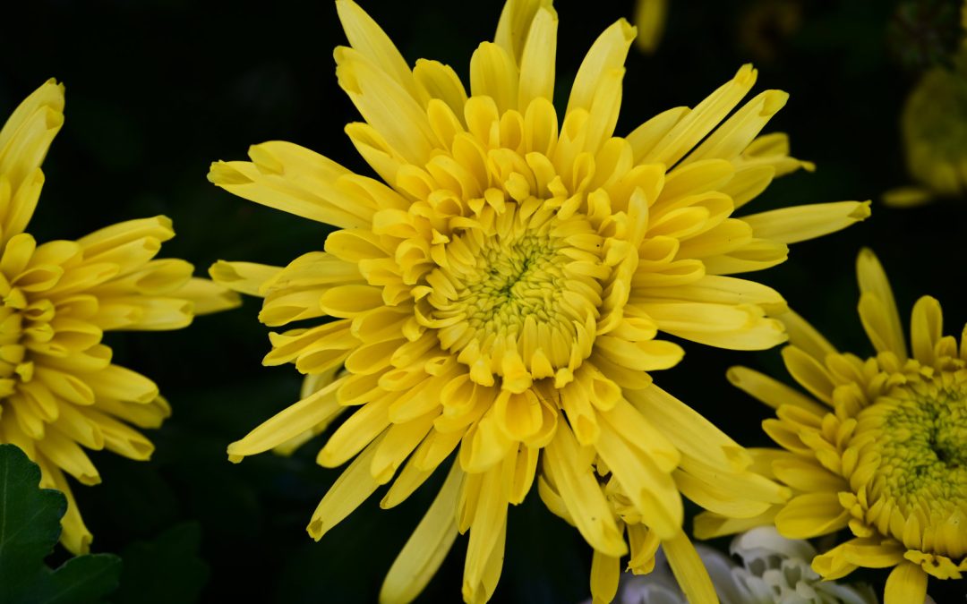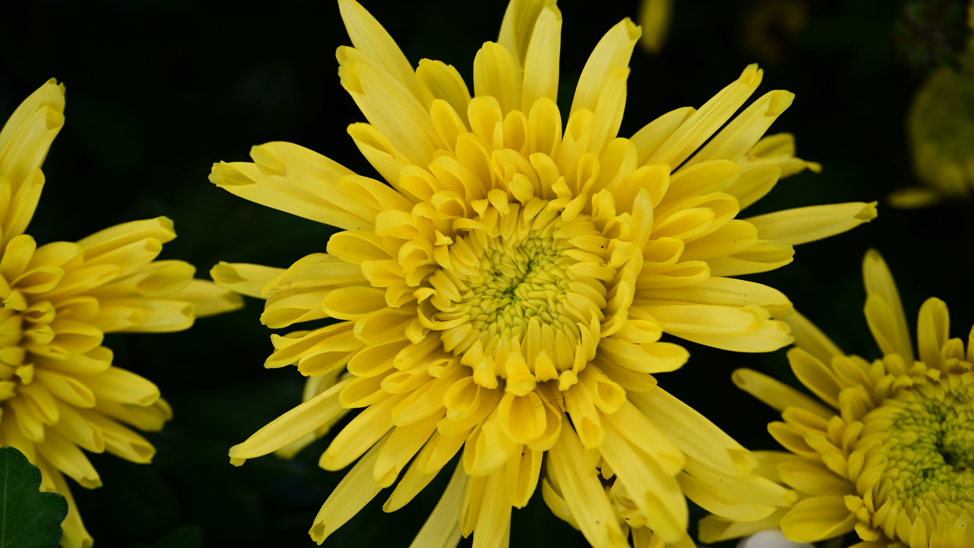 Behold the intricate layers of a rich golden chrysanthemum, its slender curled petals radiating from a soft green center.