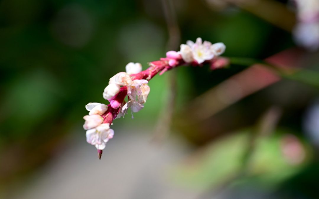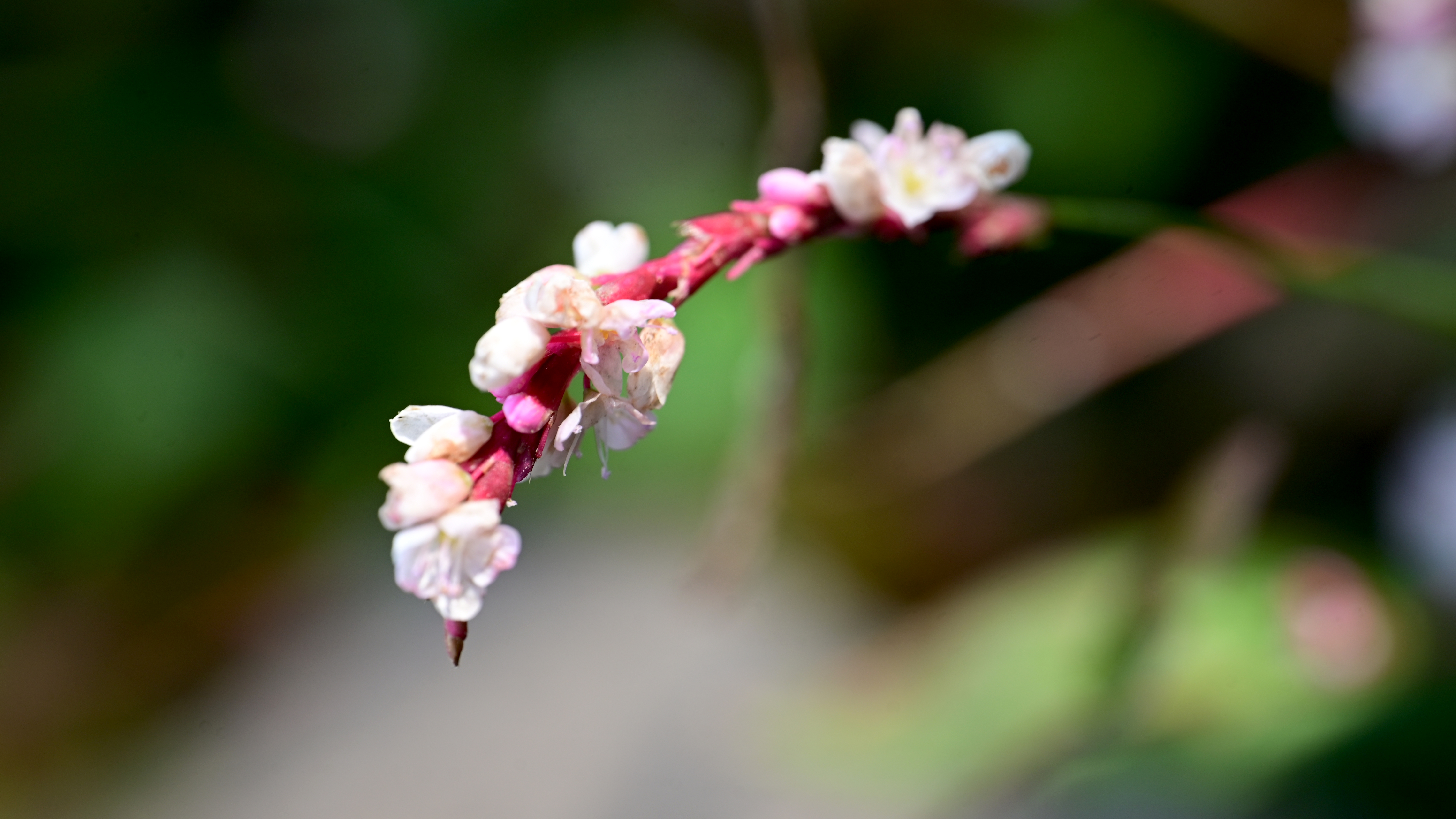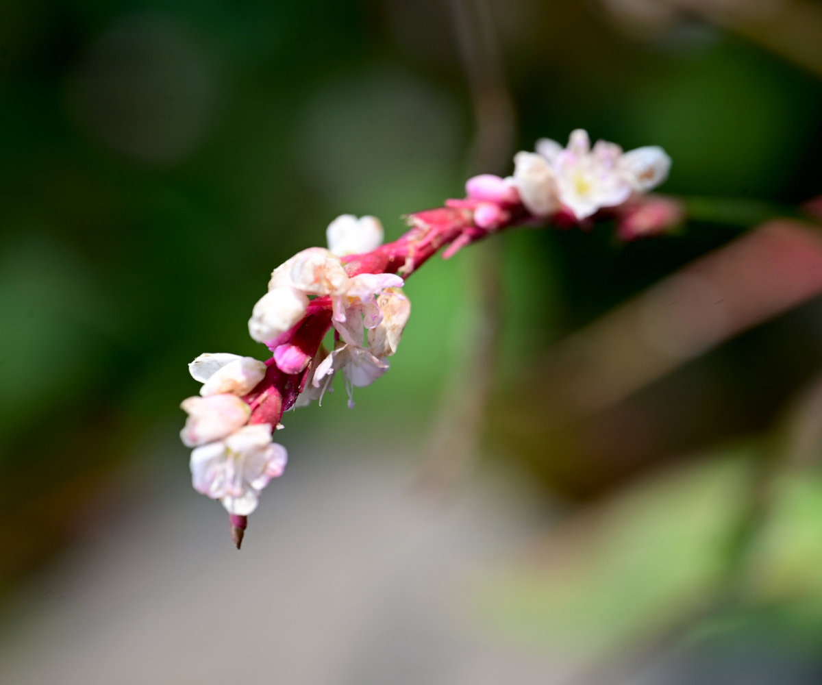 A delicate pink wildflower on a thin red stem, featuring soft petals and buds, set against a blurred natural green background.