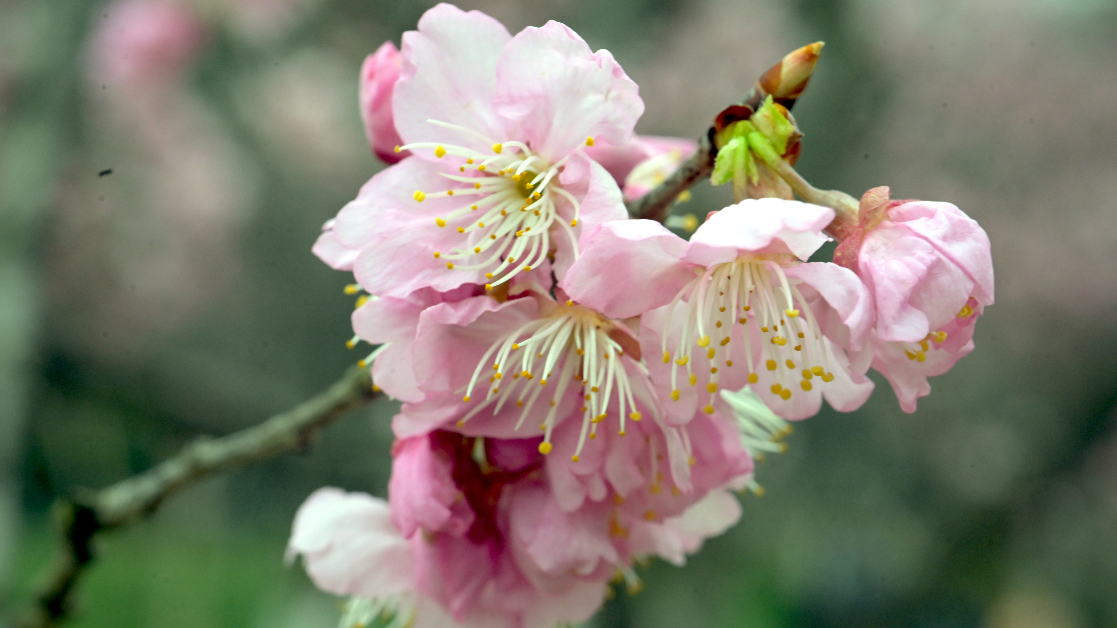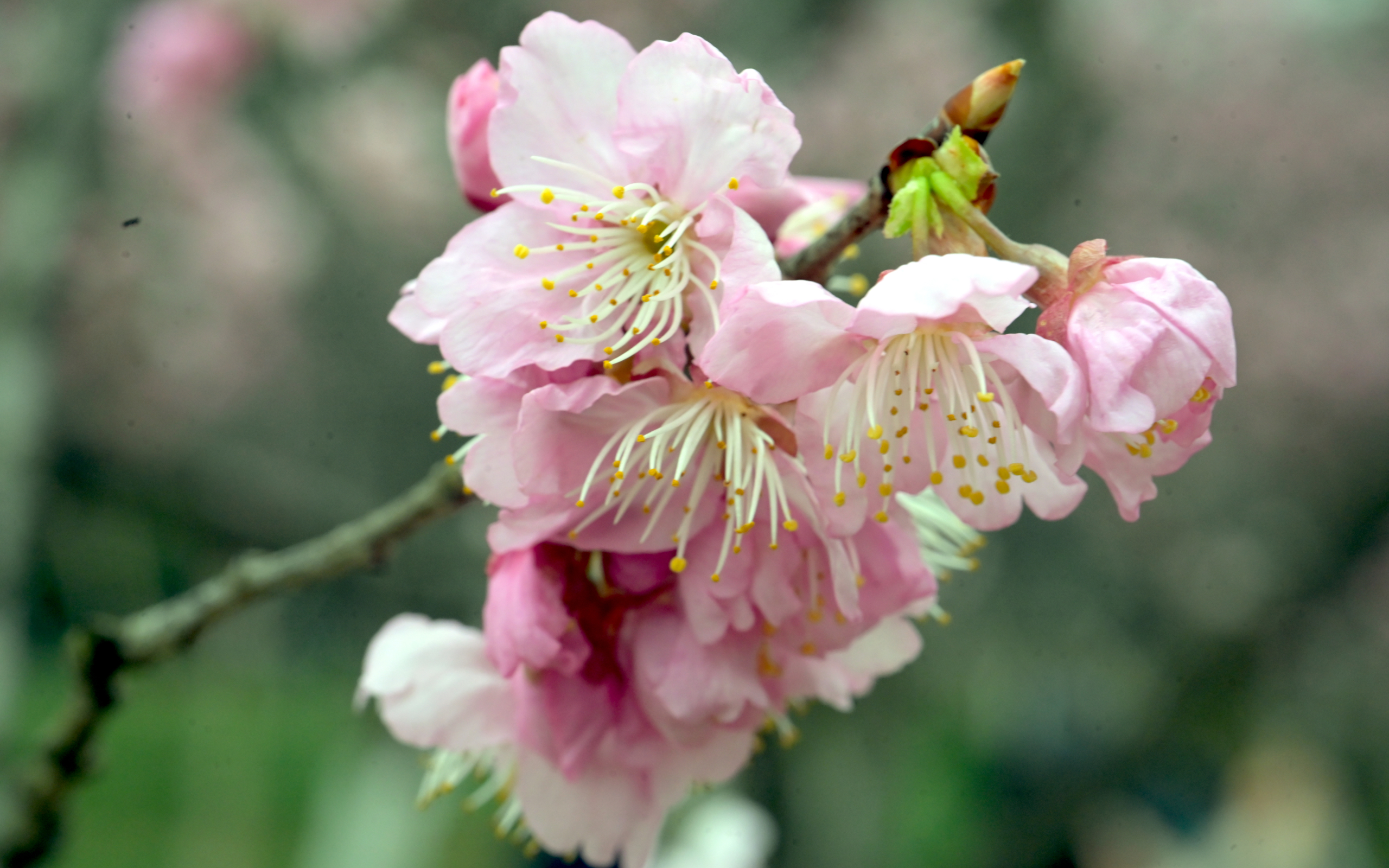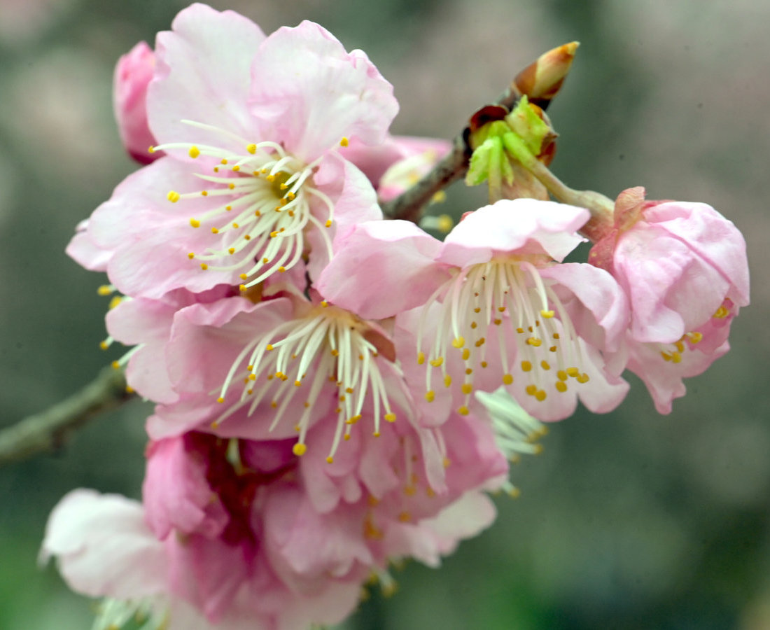 A dense cluster of soft pink cherry blossoms in full spring bloom, with layered petals and bright yellow centers.