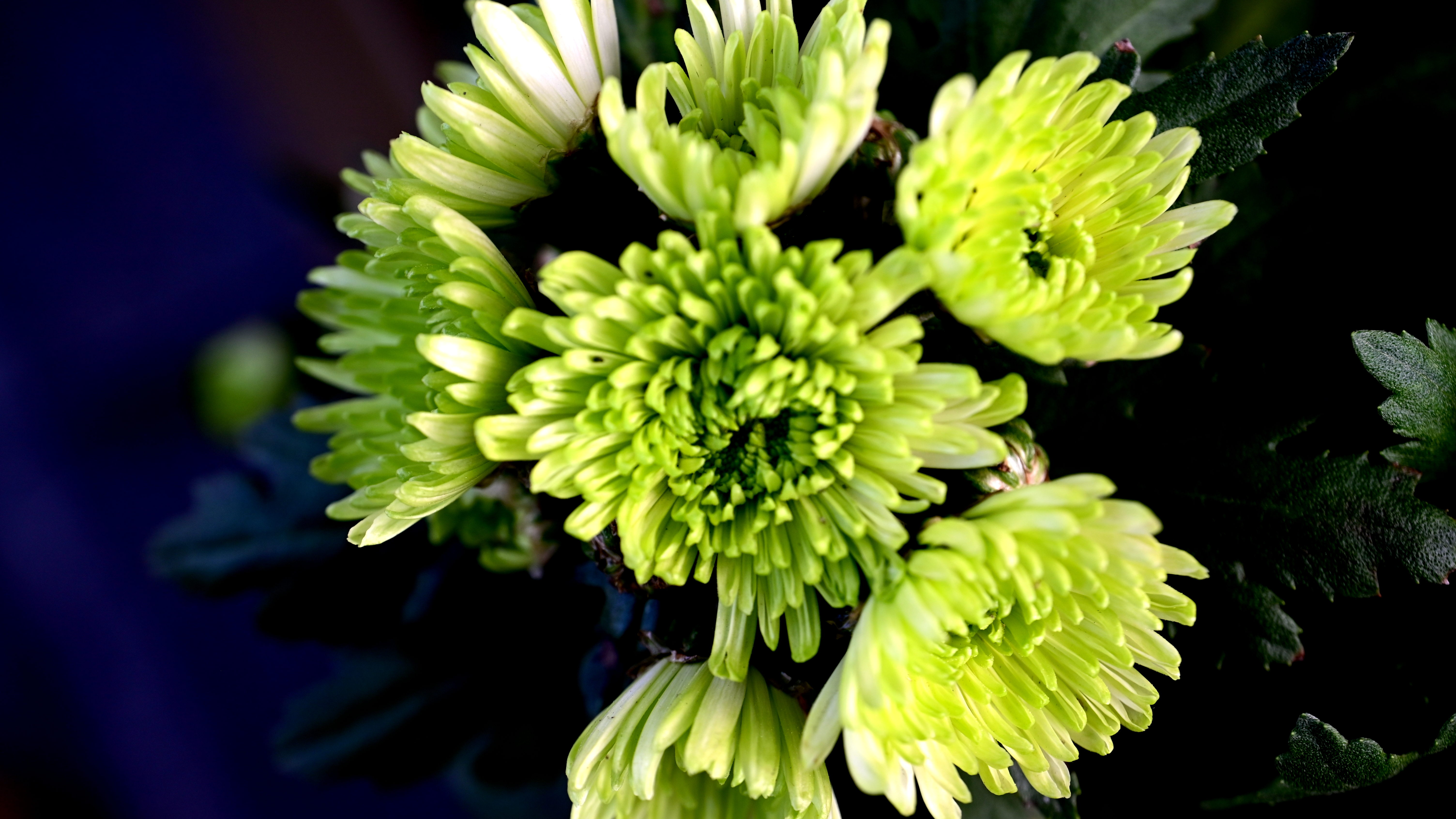 Discover the cool elegance of a cyan-green chrysanthemum, its densely layered petals glowing with a translucent jade hue against a deep.