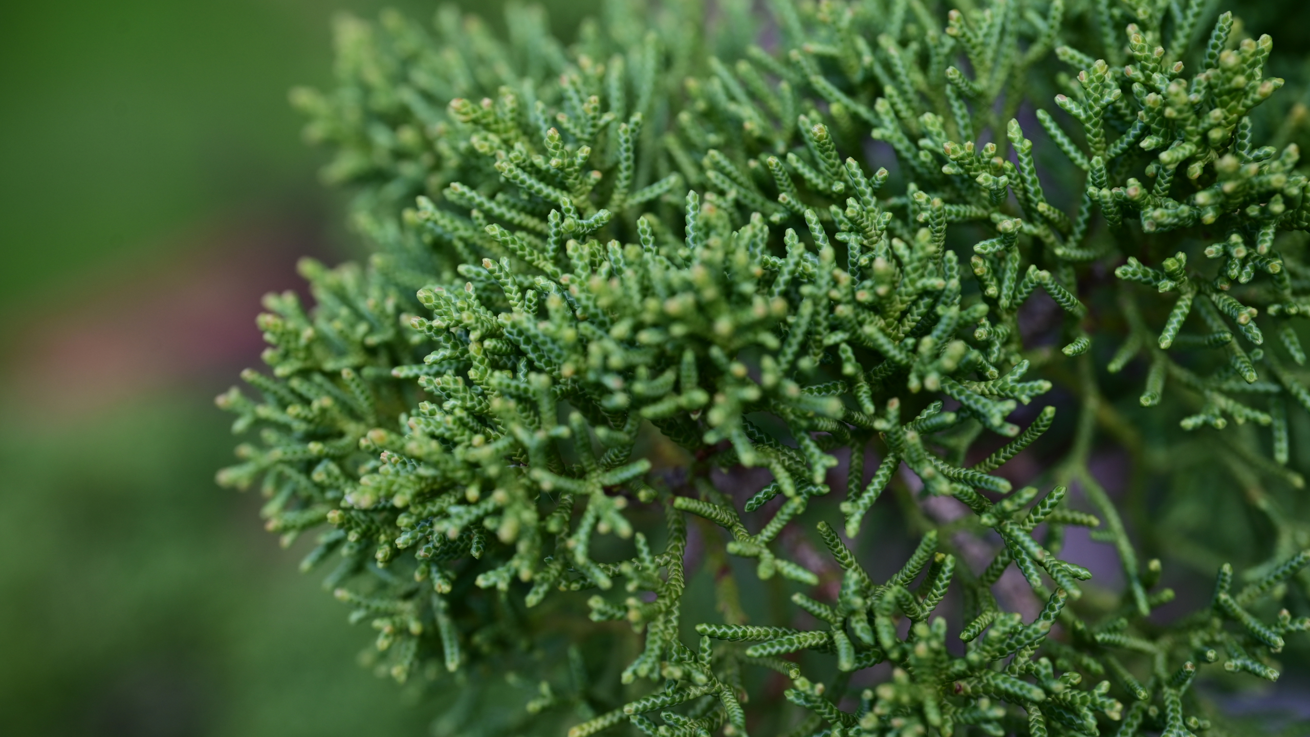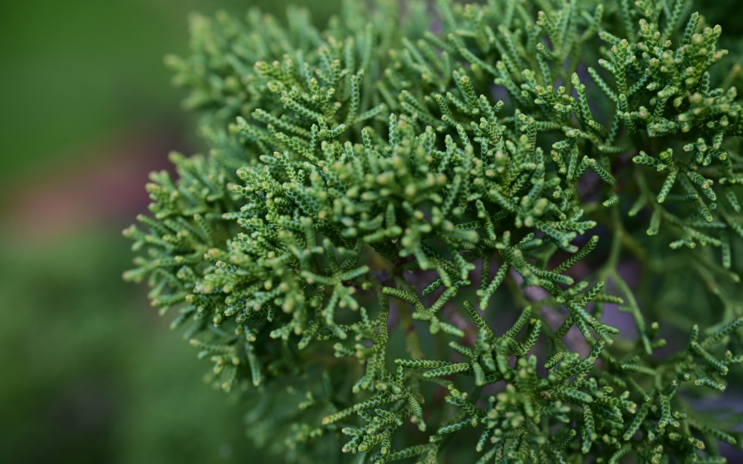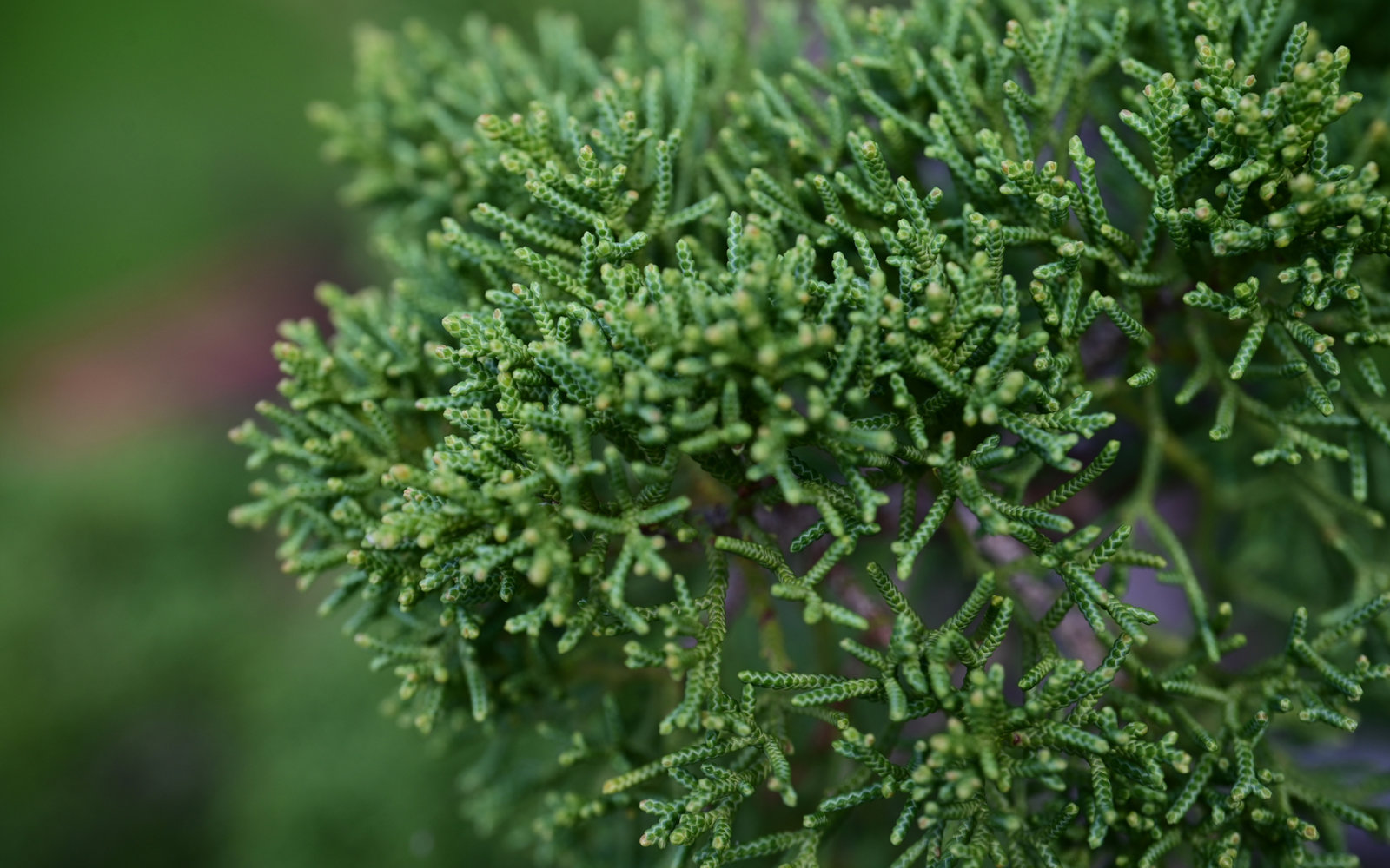This close-up photograph captures the elegant interplay of light and shadow on a lush conifer branch.