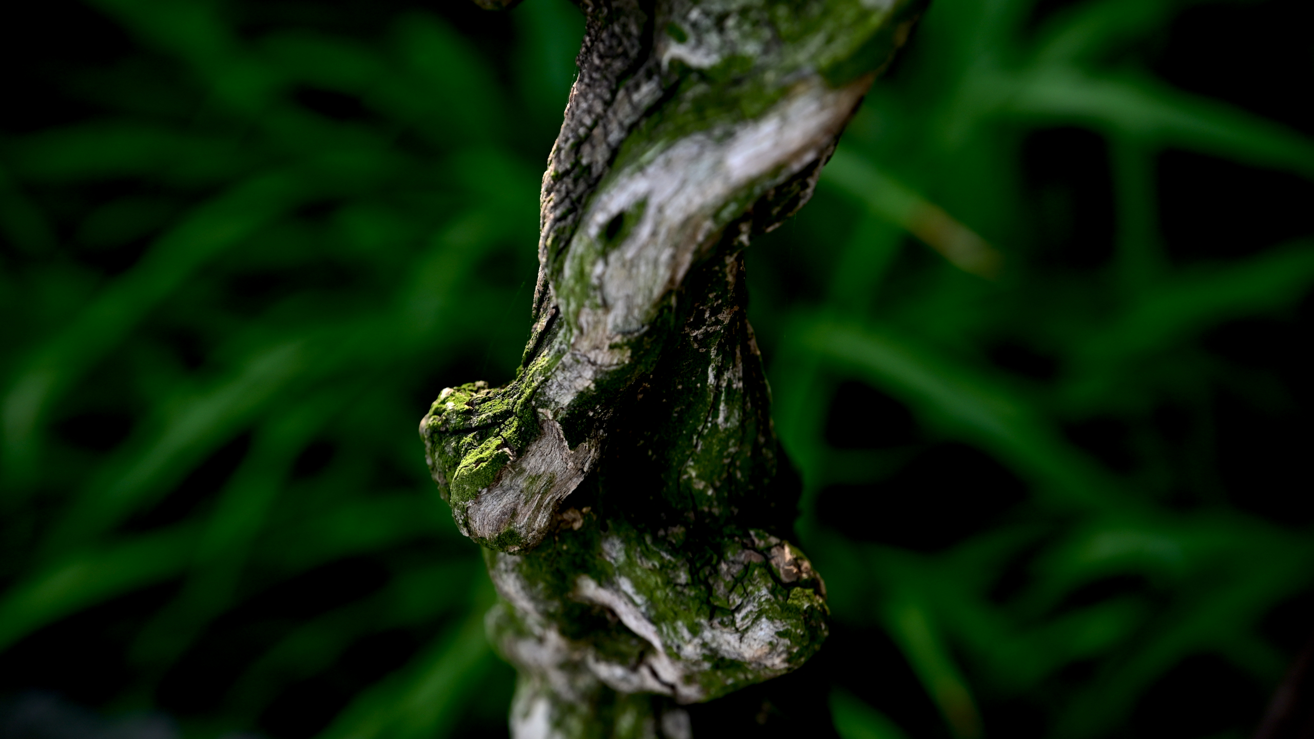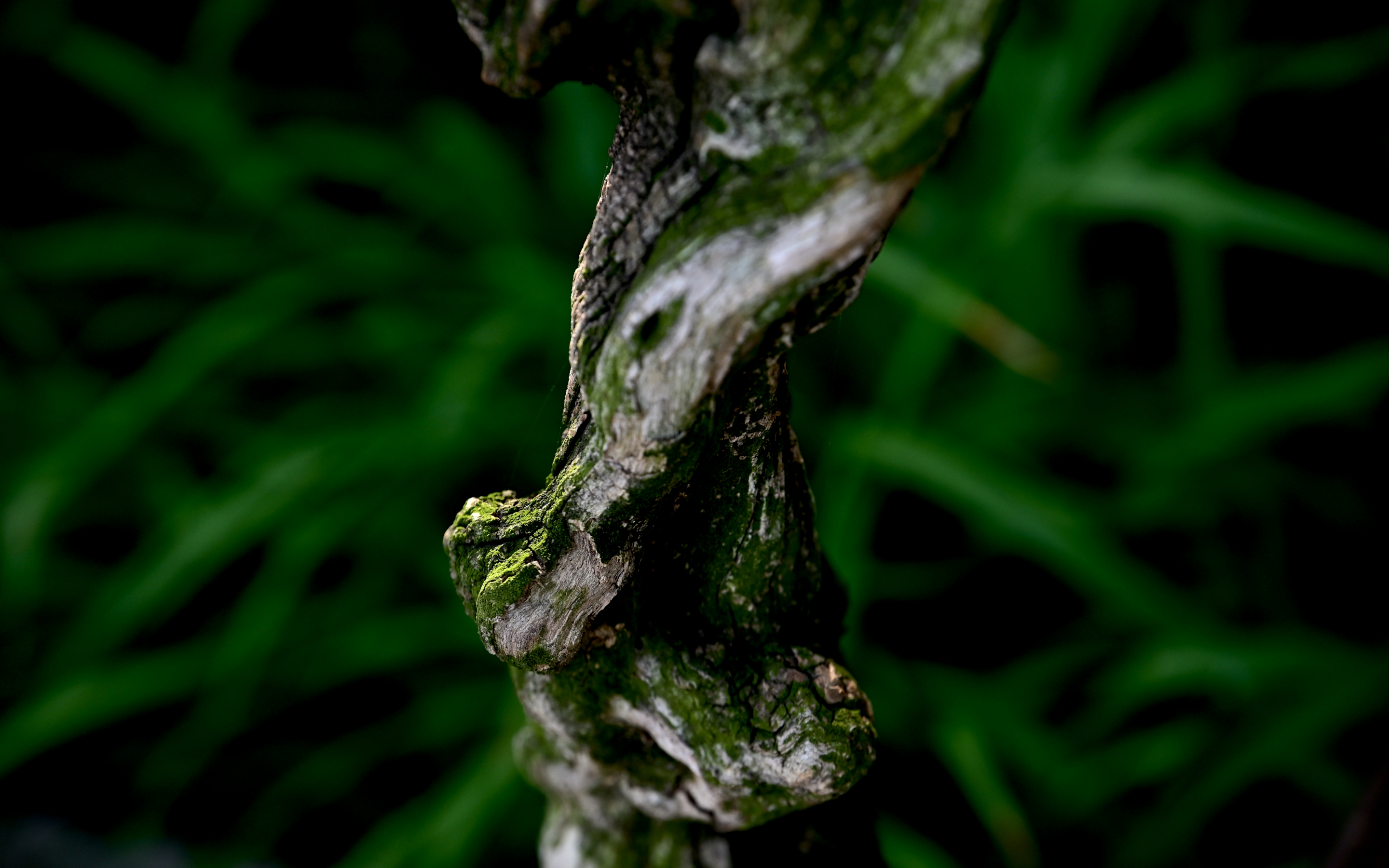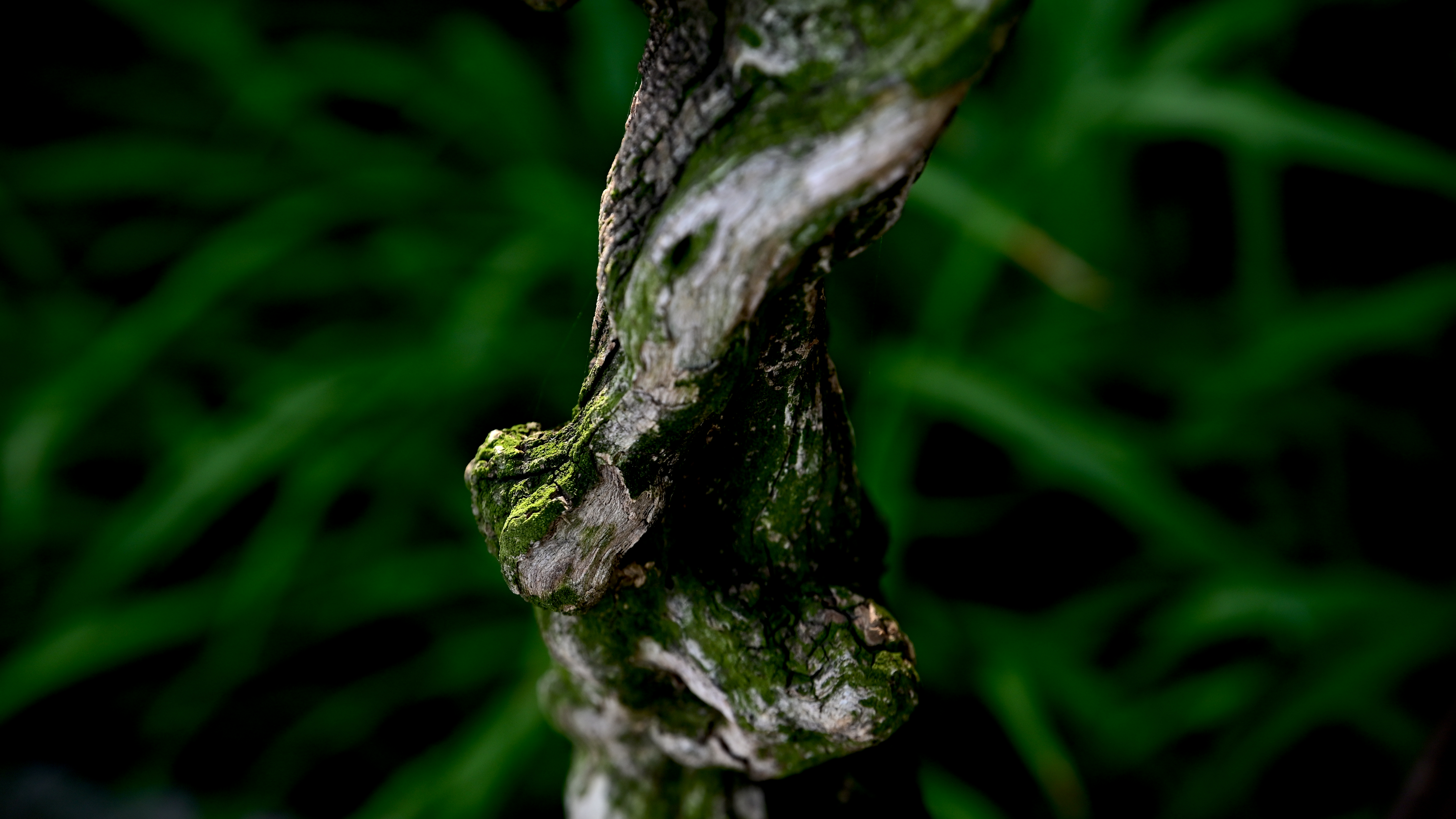 The intricate textures of a gnarled, S-shaped branch, cloaked in a lush tapestry of moss transitioning from earthy grey to vibrant emerald.