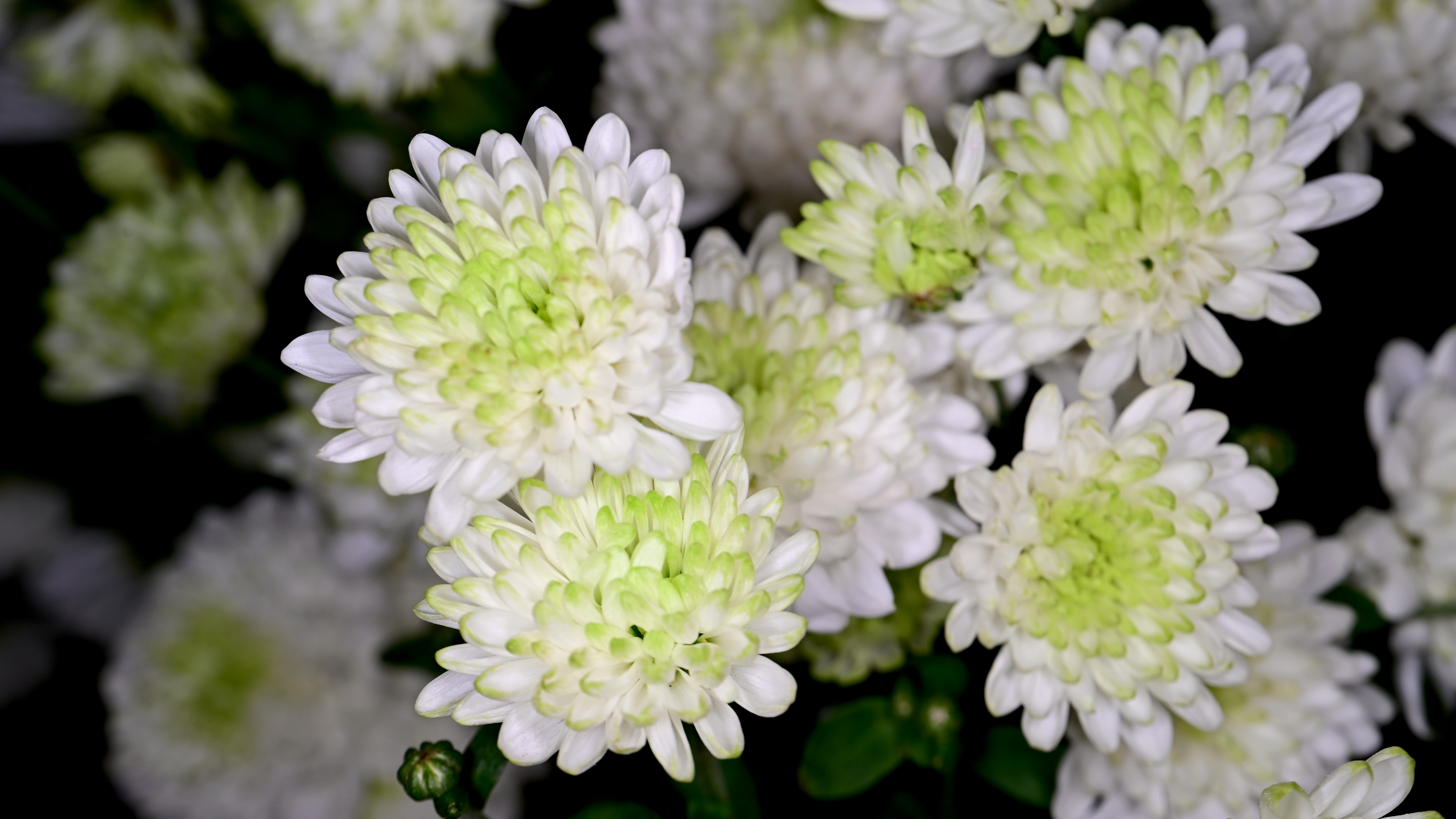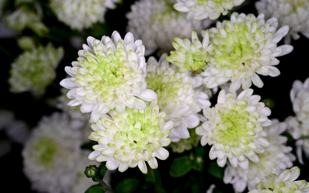 A soft green floral wallpaper featuring chrysanthemums with pale white edges, layered petals, and a fresh color gradient.