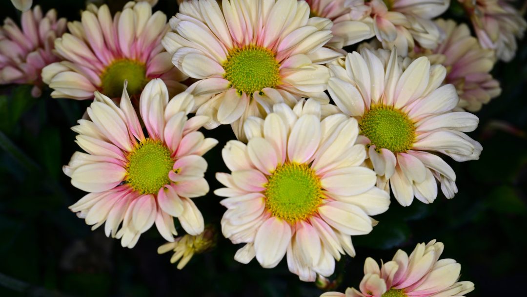 A soft bouquet of winter chrysanthemums featuring creamy white to pale pink petals, vibrant green centers, and rich leaves.