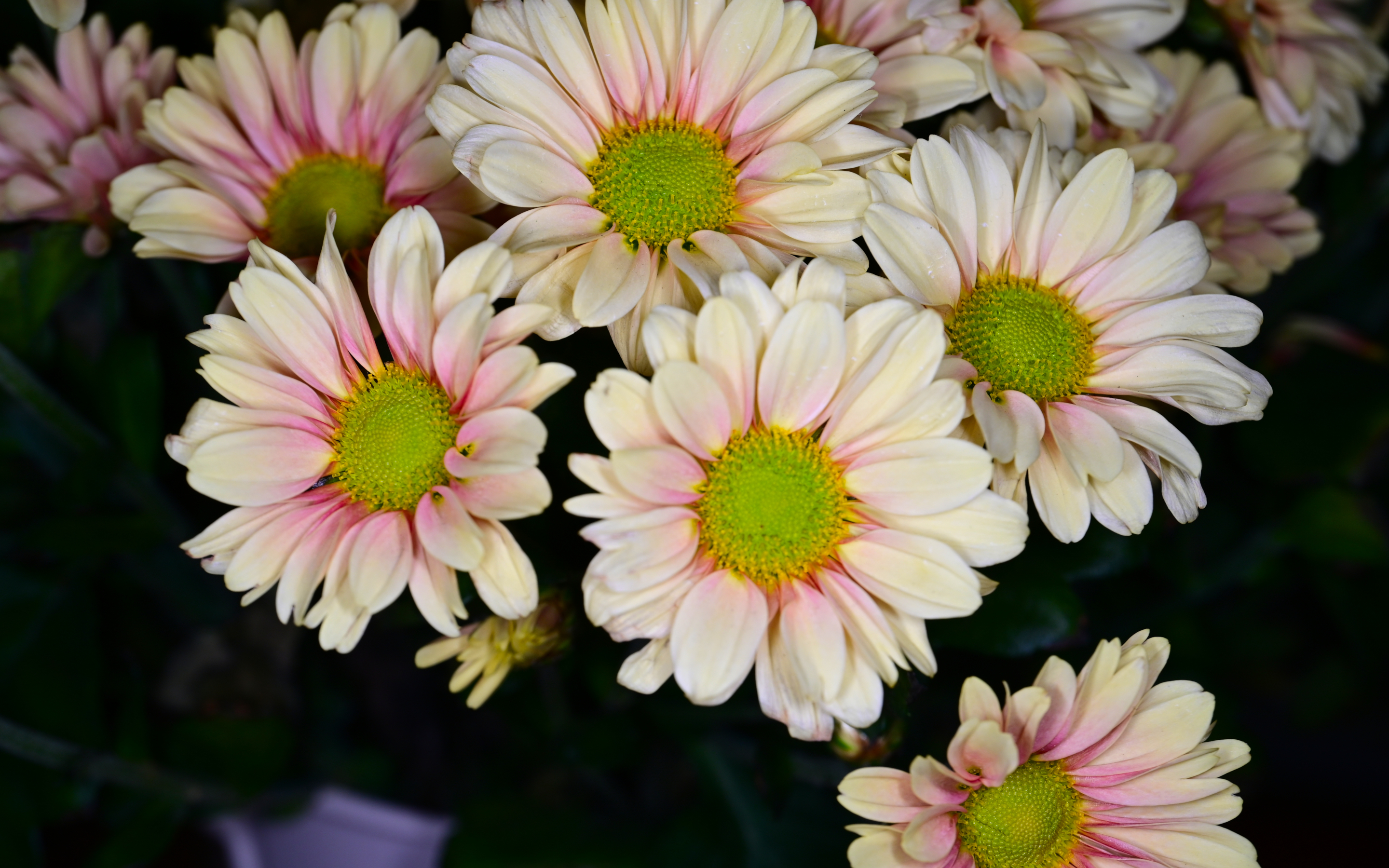 A soft bouquet of winter chrysanthemums featuring creamy white to pale pink petals, vibrant green centers, and rich leaves.