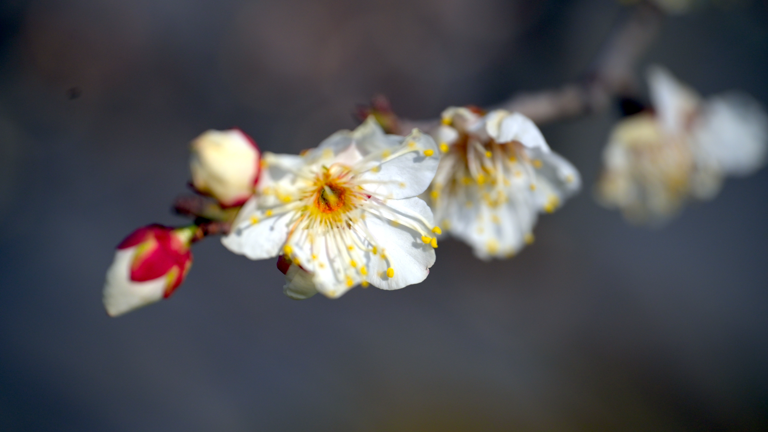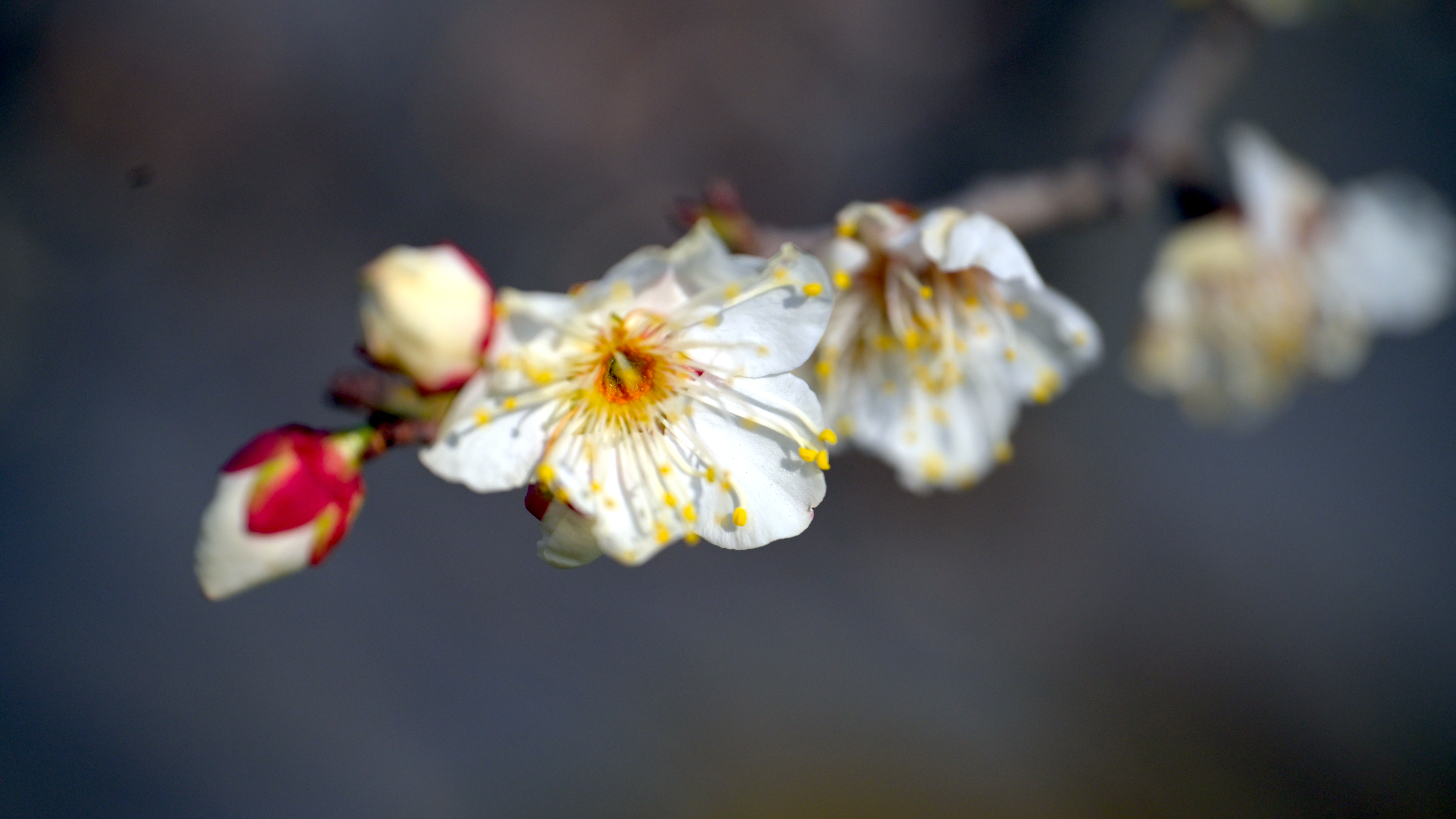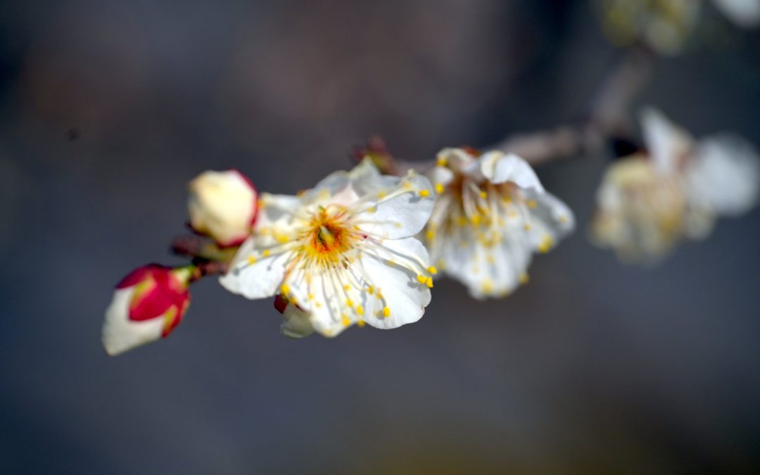 A detailed shot of white plum blossoms on a snowy winter morning, with delicate white petals.